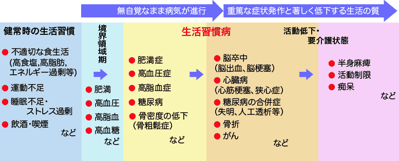 以前に、成人病といわれていた病気・・・高血圧、糖尿病、高脂血症などは、生活習慣に大きく関係し影響している事がわかりました。近年では、年齢に関係なく若い方でも、間違った生活習慣を続けていると、この病気の対象になっています。このような事から「成人病」を「生活習慣病」と呼び方が改められました。